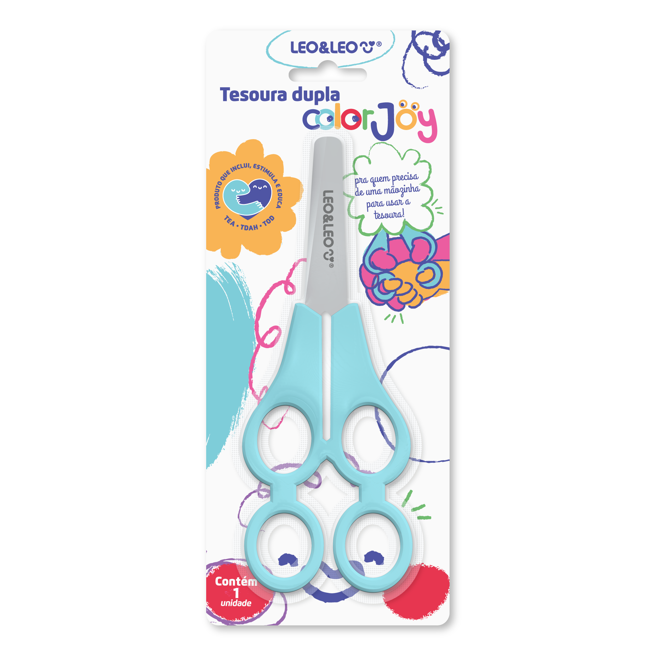 Agora, crianças e adultos que possuem alguma dificuldade motora para recortar ganham um incentivo a mais: Tesoura Escolar Dupla Tandem Color Joy – Blister Com 1 Un Leo&Leo.